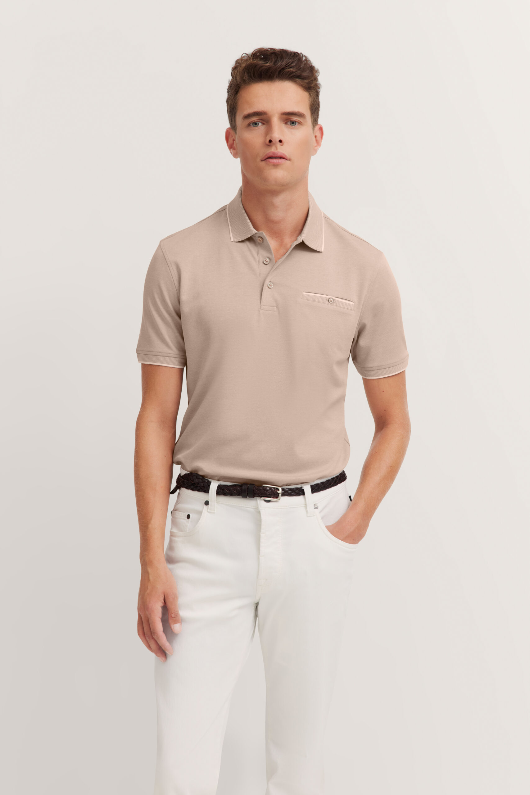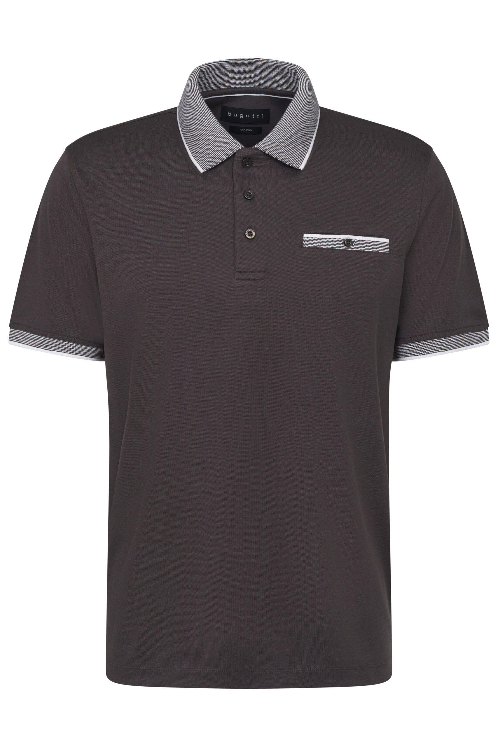 The Bugatti non-iron polo, with subtle contrasting stripes on the collar, breast pocket, and cuffs, combines timeless design with practicality.