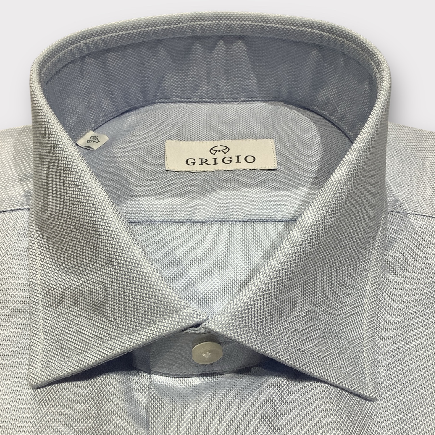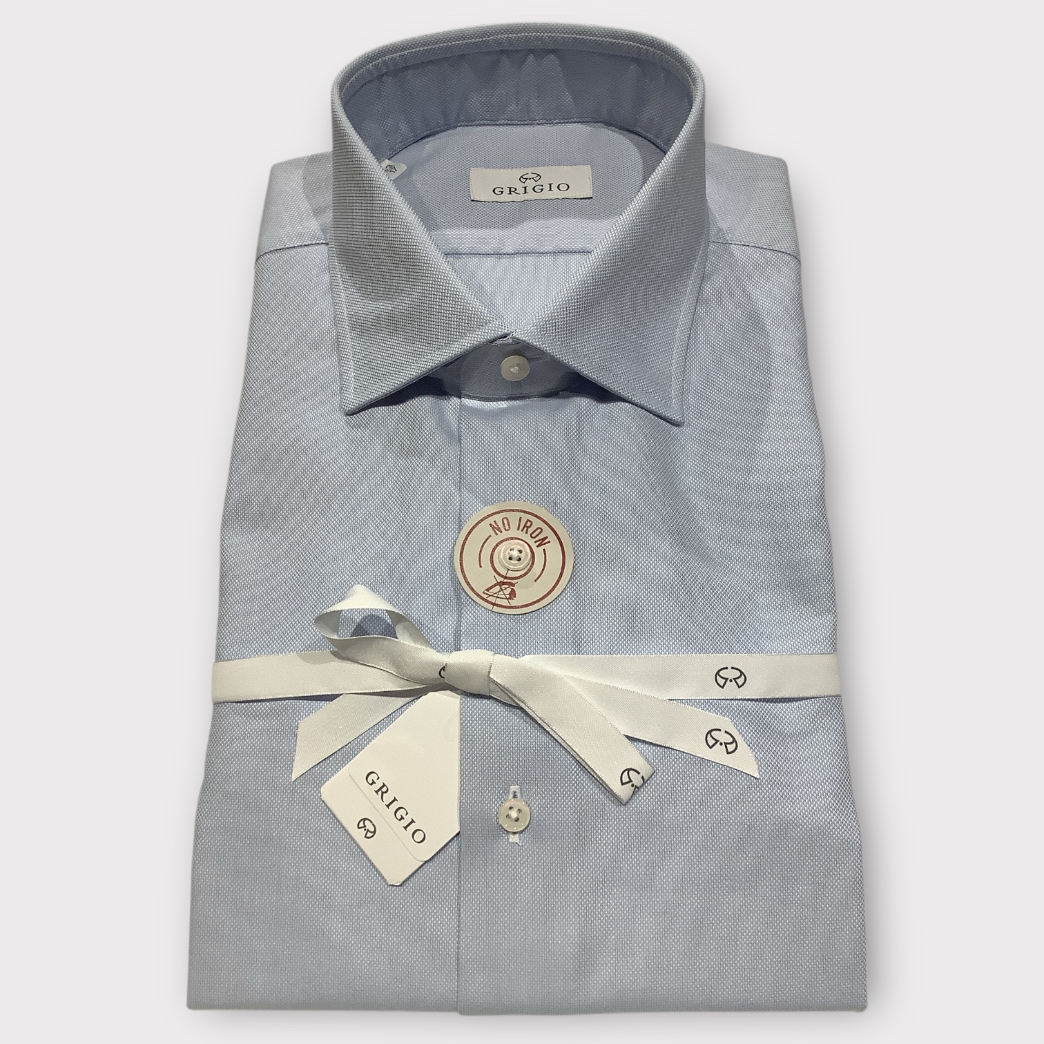 Here we have a shirt in 100% cotton textured fabric in Sky Blue, which has been specially treated during manufacture to achieve a non-iron and easy care finish.