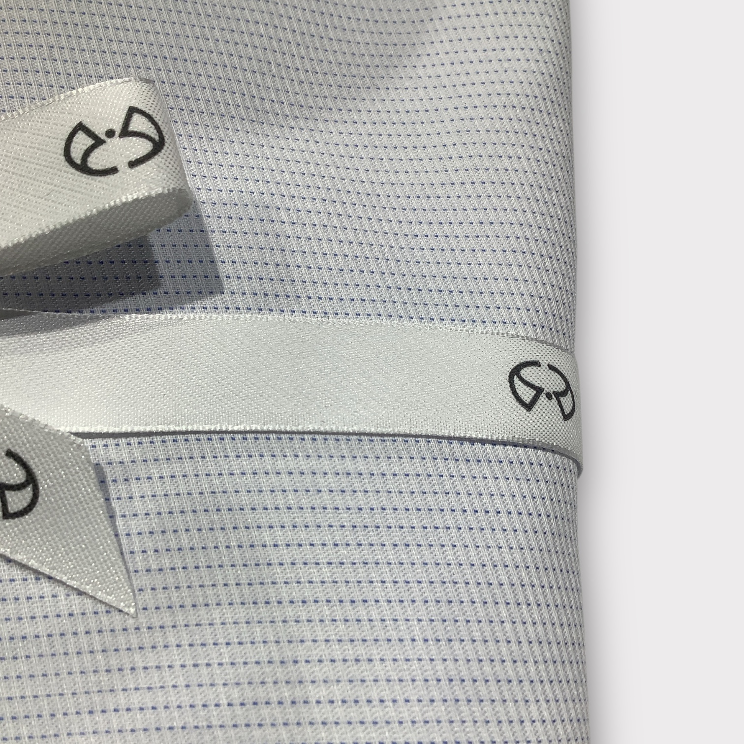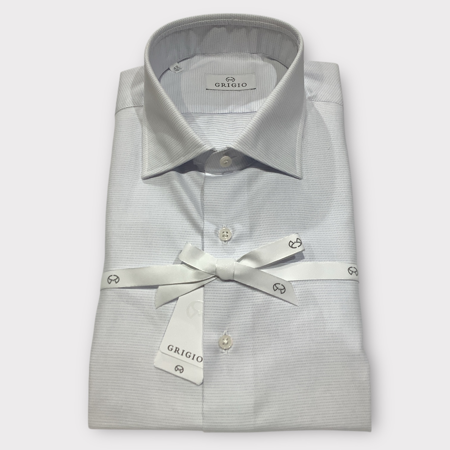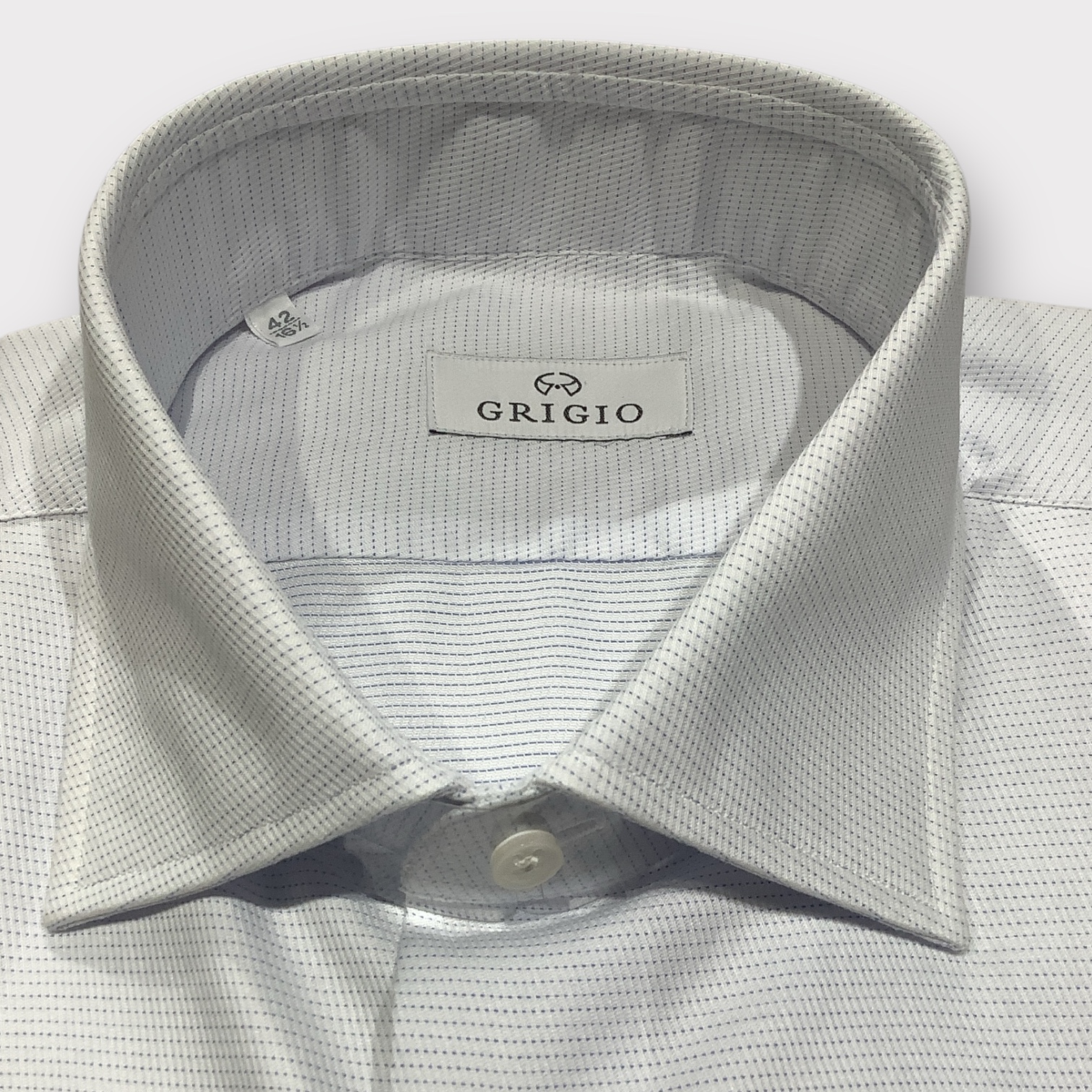 Here we have a shirt in super soft 100% cotton that has a textured weave of mostly white, with fine blue threads woven through the fabric.