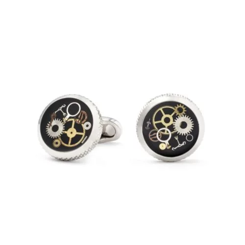 Round cufflinks with watch gears, with a knurled edge on a coloured enamel or glitter background. Slightly larger than our Boston cufflinks.